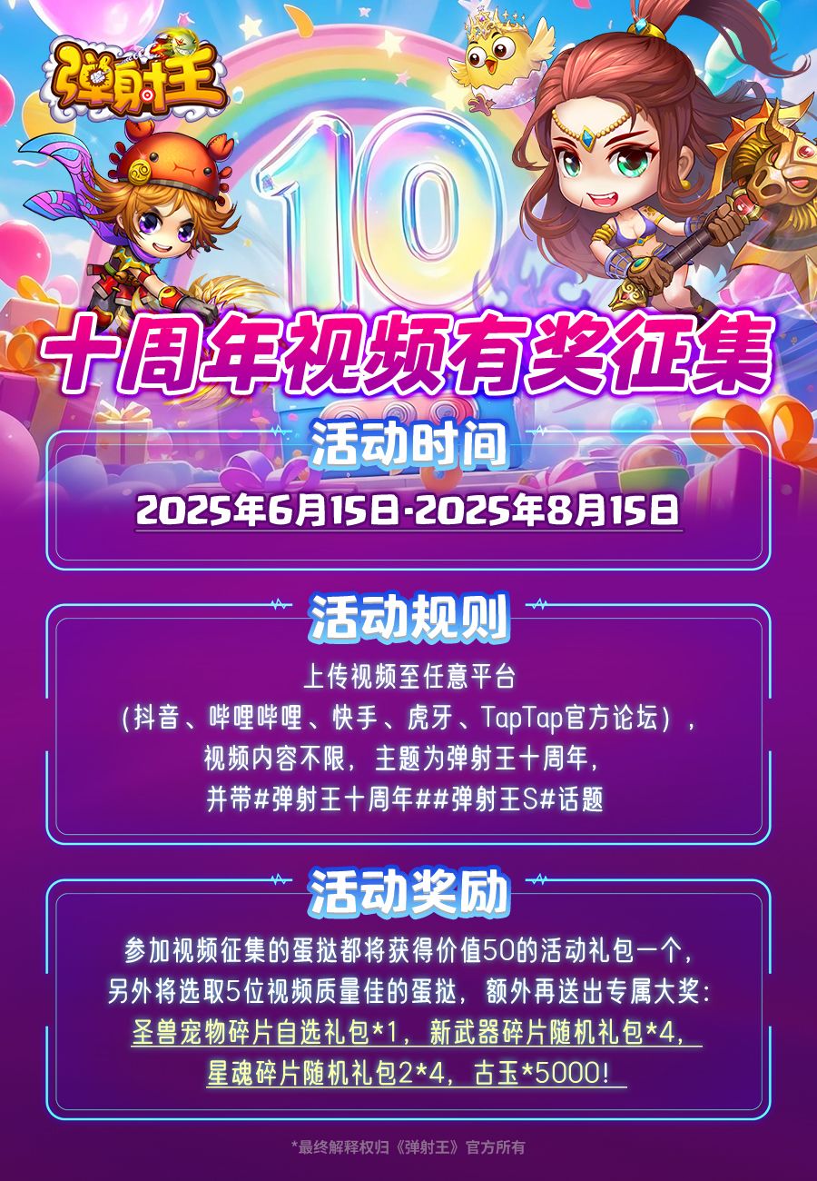 弹射王十周年视频有奖征集活动开启!在活动时间内,无论精彩操作剪辑还是生日祝福,欢迎你将视频发布到任意平台,弹妹将会为参与活动的蛋挞送上奖励~
