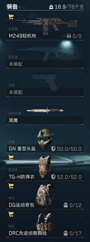 装备:新的户外棒球帽、用战术背心、DG 运动背包、DRC 先进侦察胸挂主武器:M249 轻机枪 配件方案:战术垂直握把