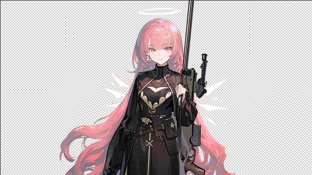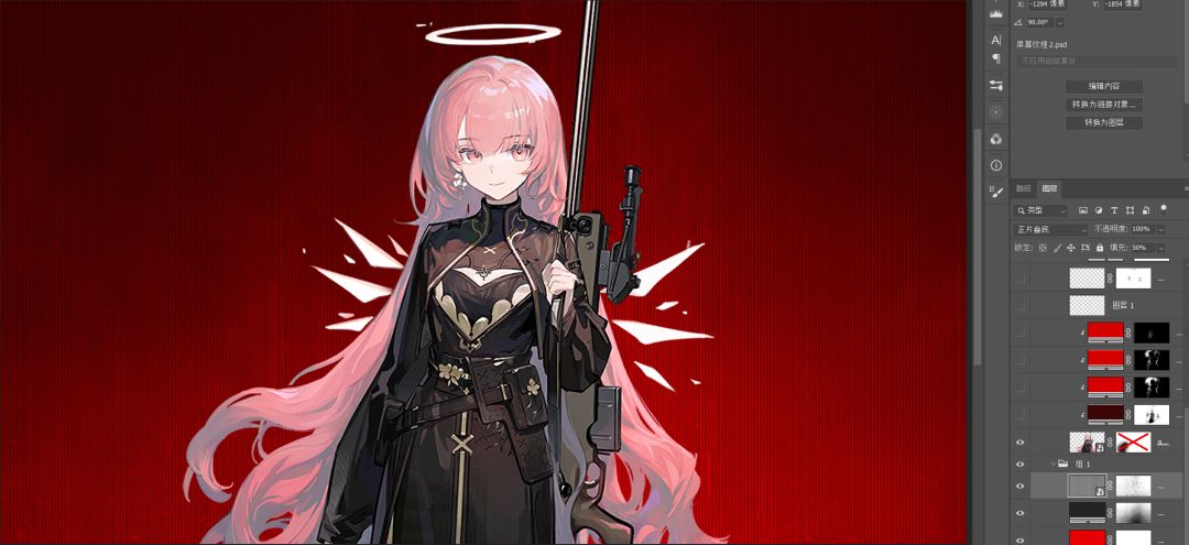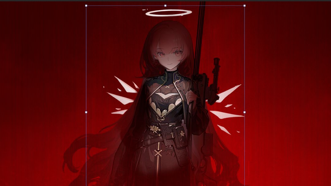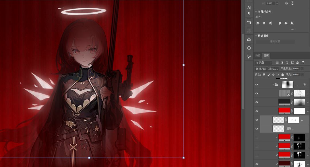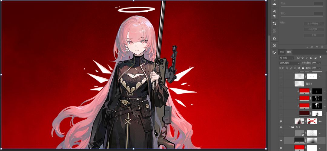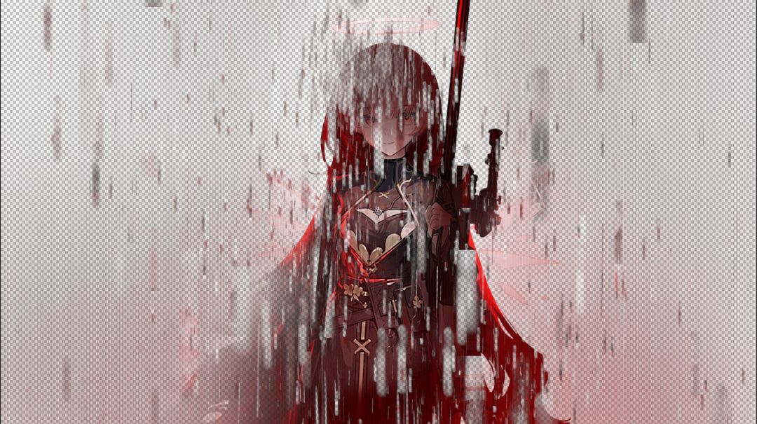 如果你有雨点笔刷可以用了,或者只要有颗粒质感就好。这里是让亮部形成一个三角,与蕾缪安立绘形成的三角形对应,突出人物。