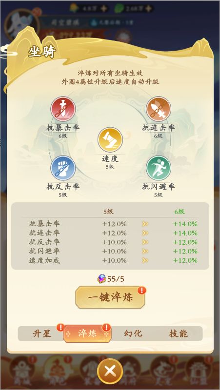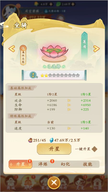 升星:消耗庚金和灵石可以给坐骑升星,提升基础属性。