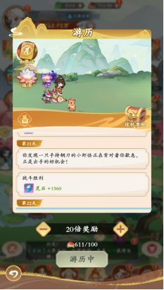 在游历玩法中,会根据道友当前的章节进度积累挂机奖励,章节越高,可以获得的收益就越大;挂机奖励可以积累一定时间,及时领取哦~