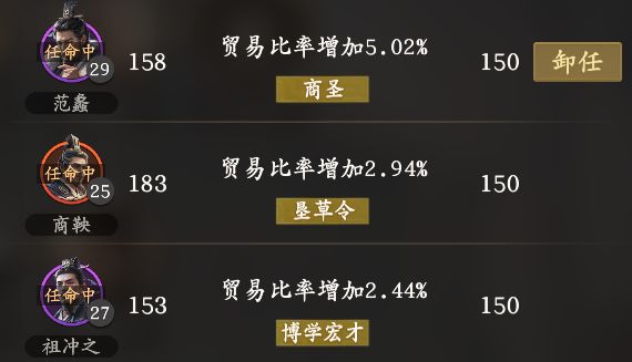 贸易官:范蠡,其余都没有太大差异。但游戏可以手动分配资源产量,因此规划好后很少贸易交换。