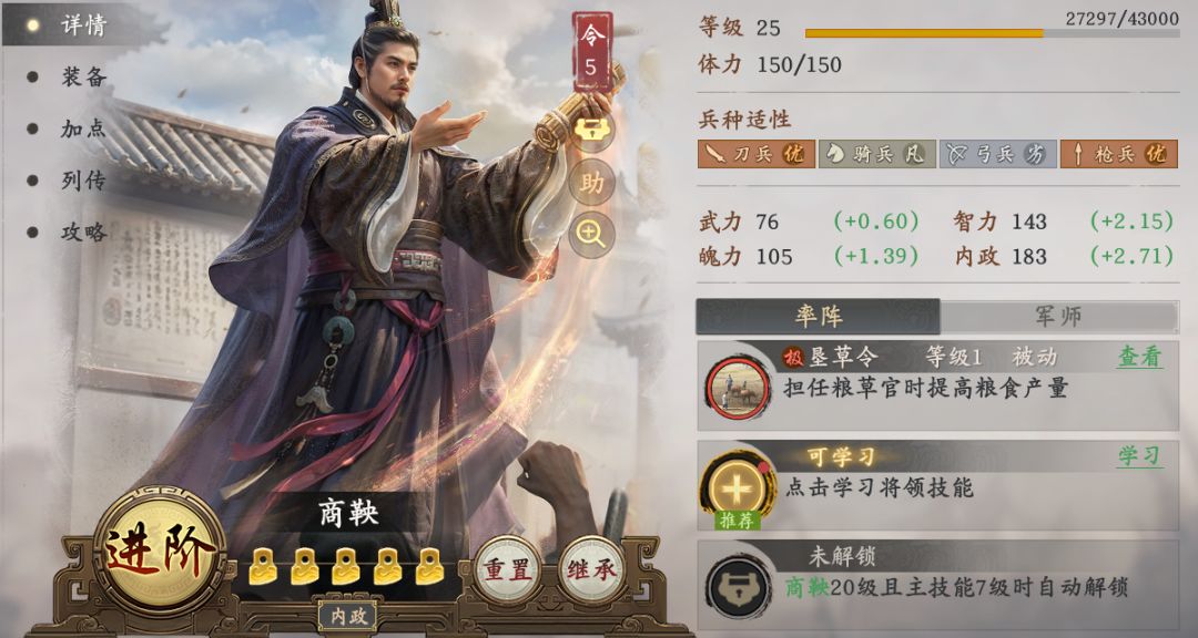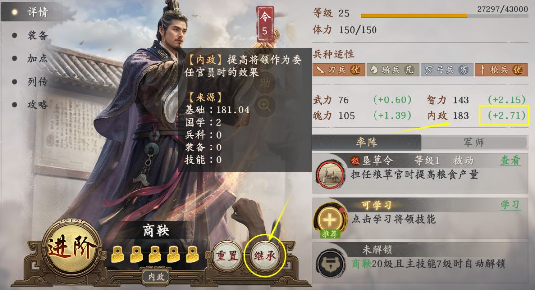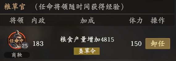 4.可以将当前任命的将领卸下,利用继承功能与需要练级的将领交换等级。任命的将领毕竟是不出战的,换完重新任命扣除体力影响不大。但是等级变低后的内政加点和成长值会变少,影响产量。