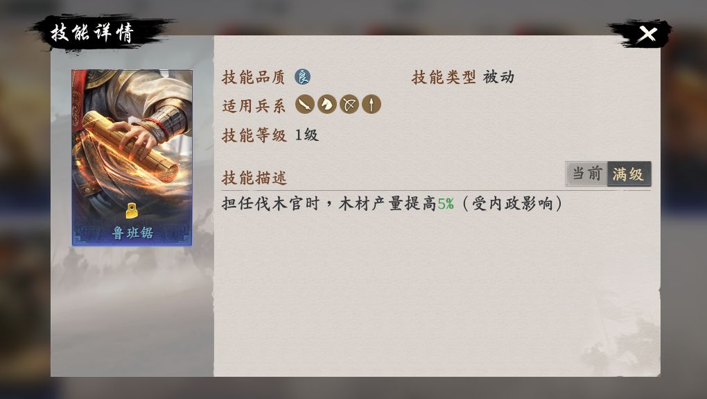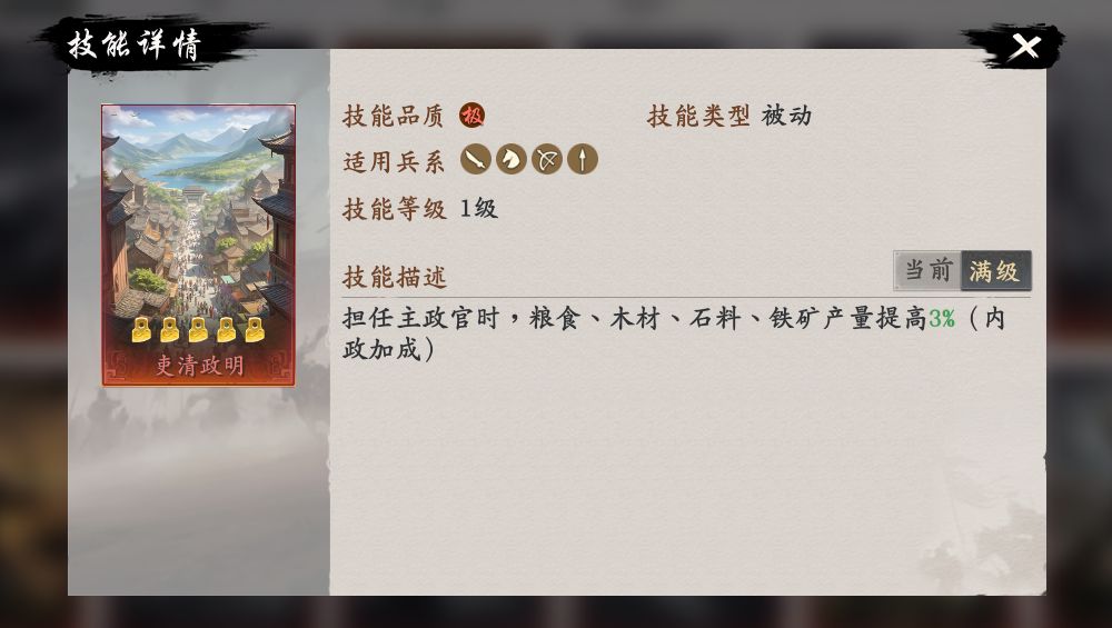 内政技能当前共有6个,可以在获取后立即给对应内政官装备上,提高内政效果:
