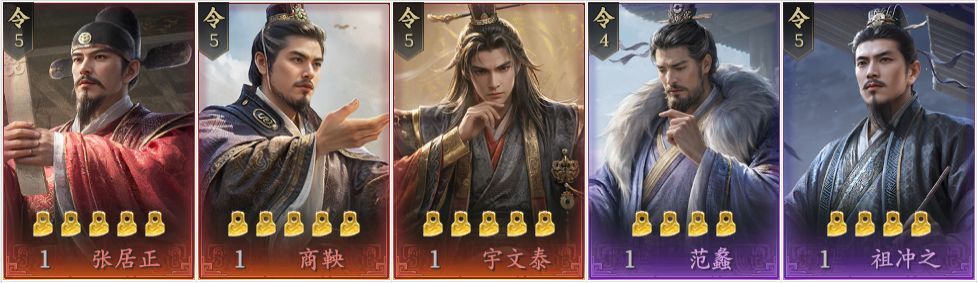 主政官:首选张居正、商鞅,基本没有差异,下位替代范蠡、祖冲之。