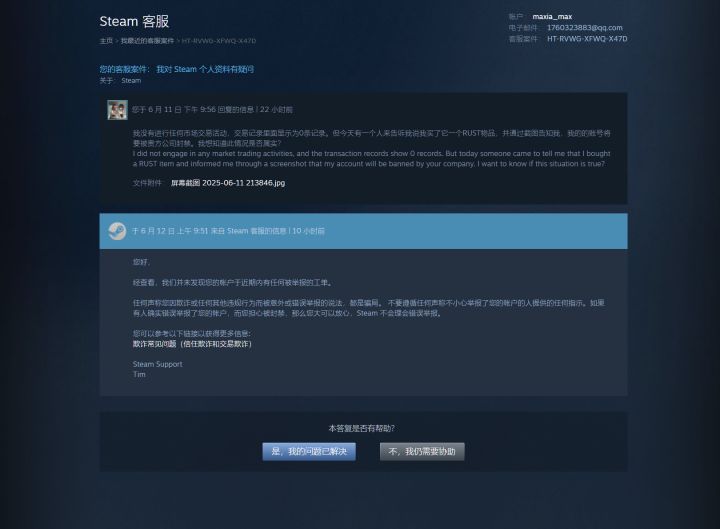 3、起初我没太在意,还想问他要QQ号,加个好友一起解决问题。但聊的多了,祂就一直重复一些机翻味的话,就暴露了。我就没理他了,赶紧联系steam客服问问情况。