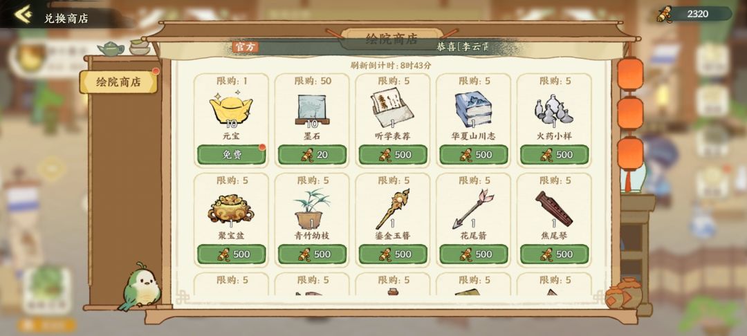 绘院商店每天可免费获取10元宝。