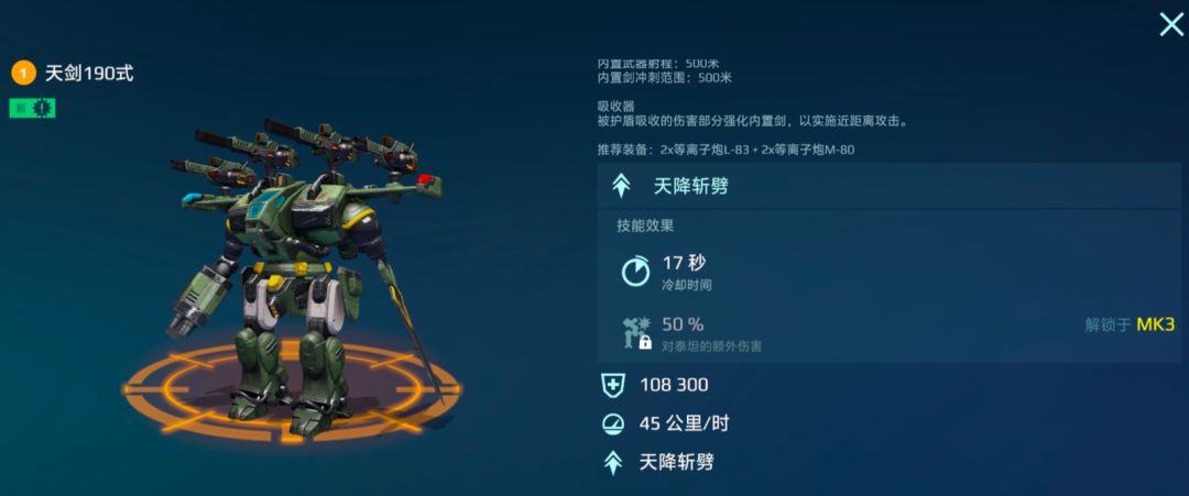 当配置齐全后,[天剑190式]的伤害能力将无视机甲与泰坦之间的鸿沟,达到与泰坦相抗衡的作战能力。