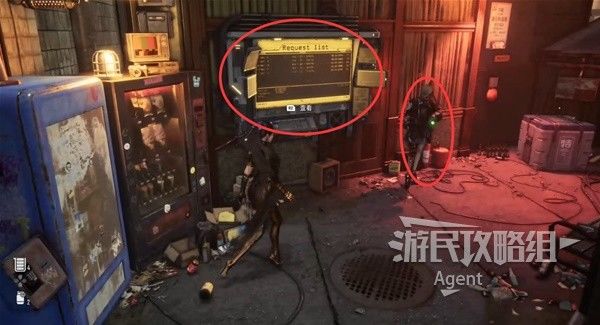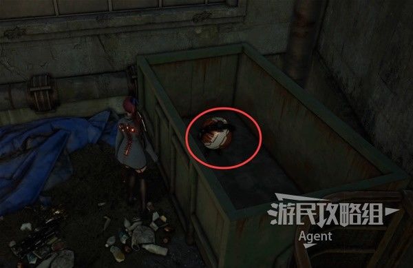逛逛并搜刮下城里,北面下图位置的房子后面有个密码箱,【密码】就在附近的绿色垃圾箱里,打小机器人就能得到。