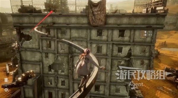 先跳到栏杆上,然后利用飞行机器人往上跳上塔顶。