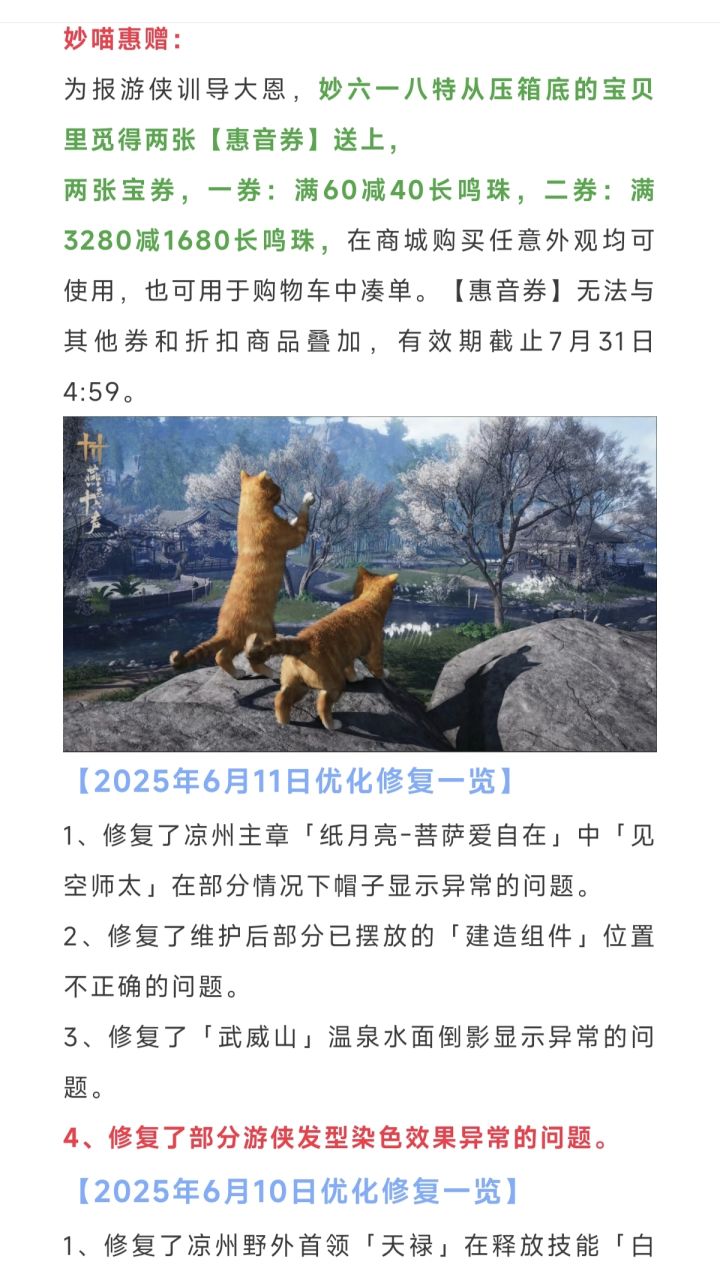 逆水寒明天新活动前瞻,赠送2张打折券,免费配饰【喵听令】,发型染色BUG修复!