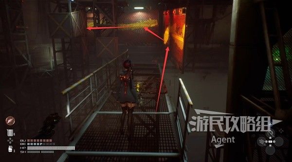往前跳落到钢条上,过去射爆圆洞里的发光亮点,即可关闭所有机关。
