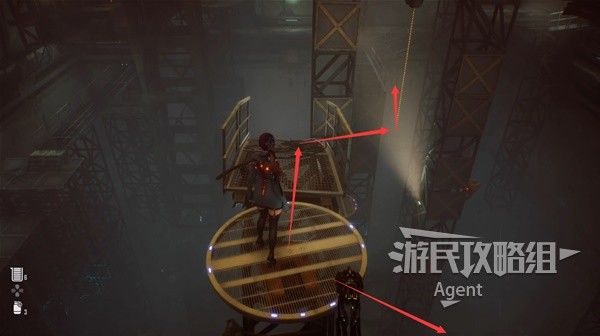 往前走抓绳子跳是主线目标。不过注意,如果回头看,乘坐另一个飞行机器人,可到那边拿到个隐蔽的宝箱。去拿完宝箱再原路返回这里,往前走抓绳子跳。