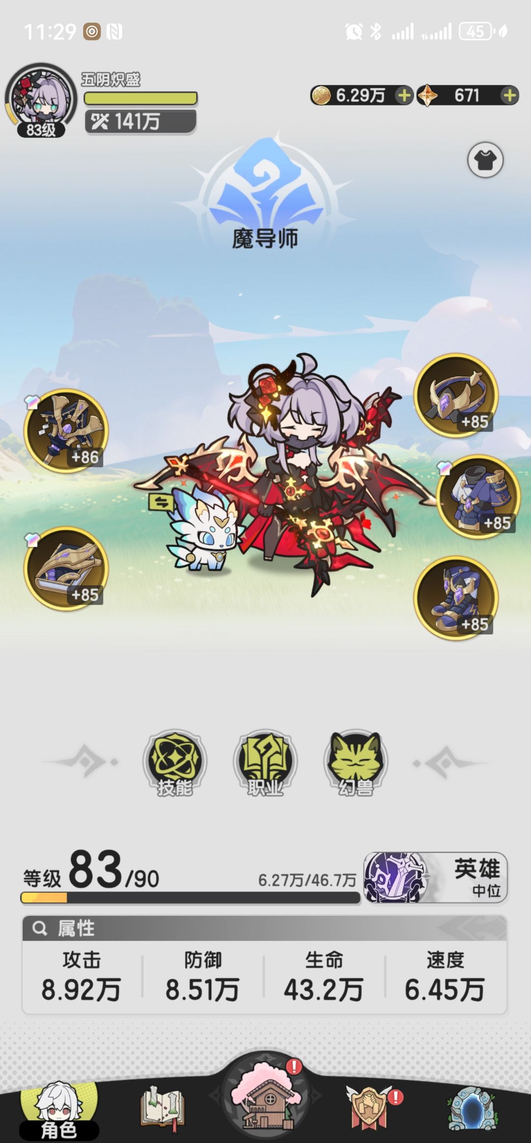 pve的技能组比较方便,核心就是靠四元素的高精通和高频的攻击打天雷的附伤,火系的流星适合推图和副本,如果打单体还请换成爆炎,今天的圣兽试了一下已经可以单杀了。