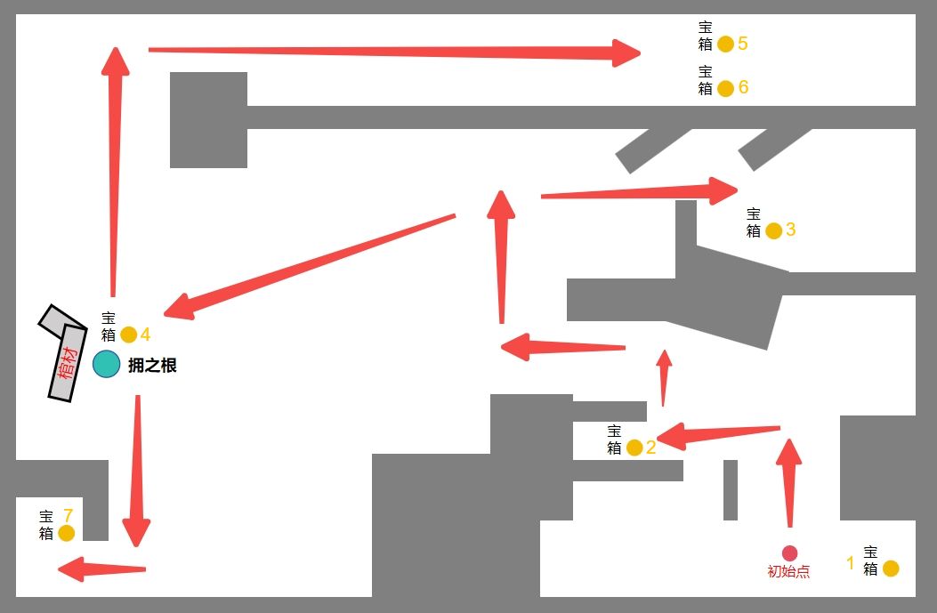 这个地图比较空旷,共有7个宝箱,找不到方向的小伙伴可以先看一下这个方位图。