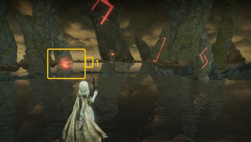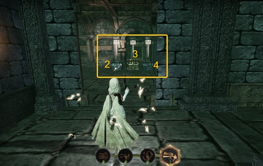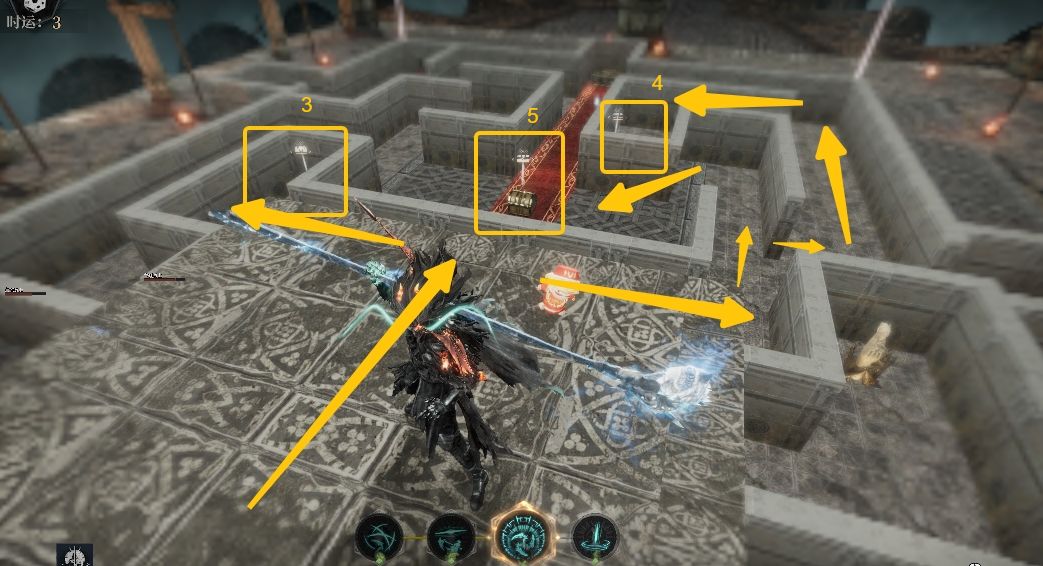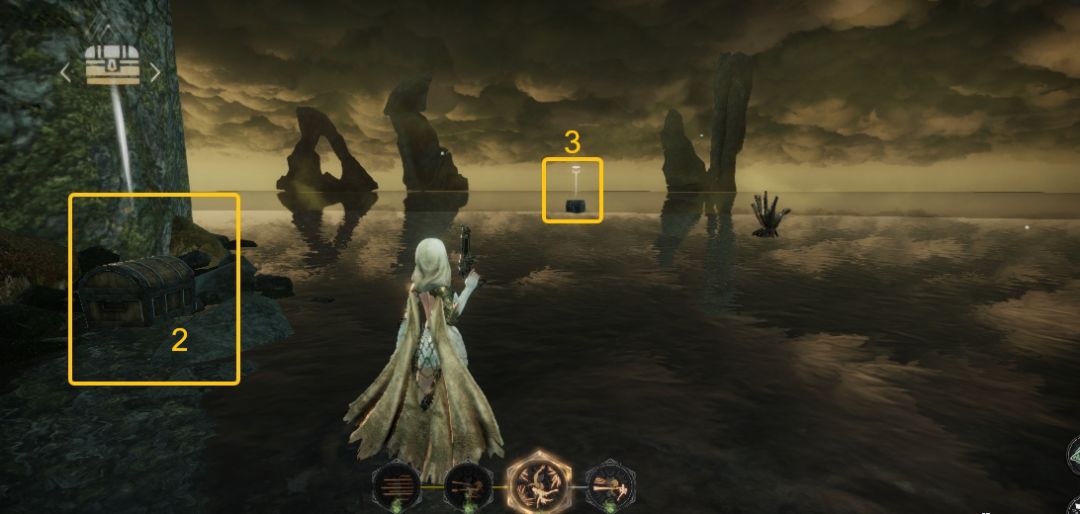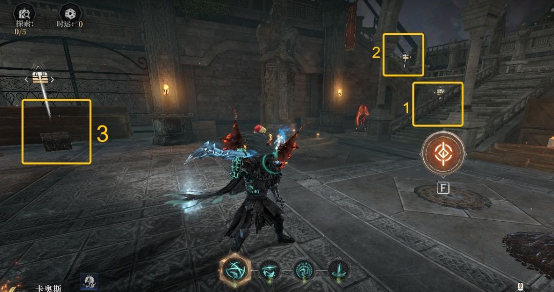 在中间有个第1个宝箱,站在宝箱处视角右转,激活这两处柱子,再顺着左边的柱子往里走。在里面可以看到2个宝箱,击杀两组怪物刷新第3个宝箱。