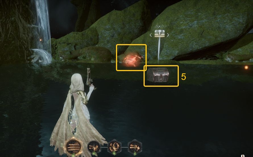在初始点前面有一个宝箱,继续往前走在拥之根边上有第5个宝箱。