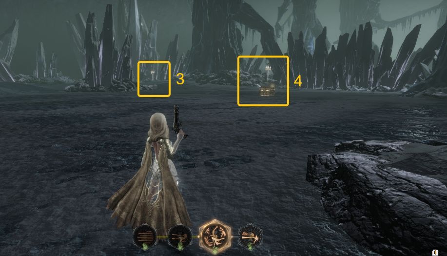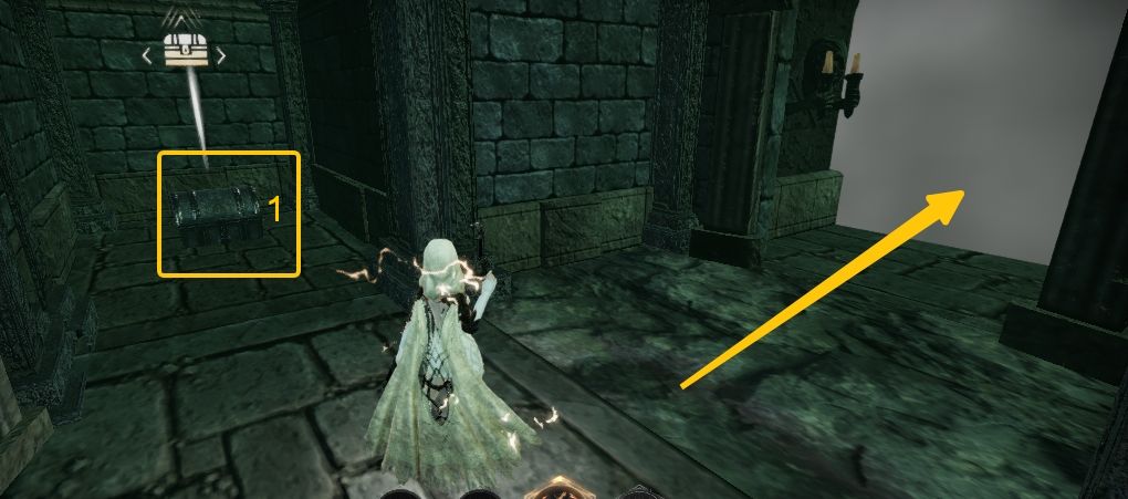 接下来回到第1个宝箱处,镜头左转去激活这两个柱子,再往左边的柱子下走,柱子后面有第4个宝箱。