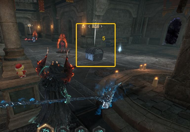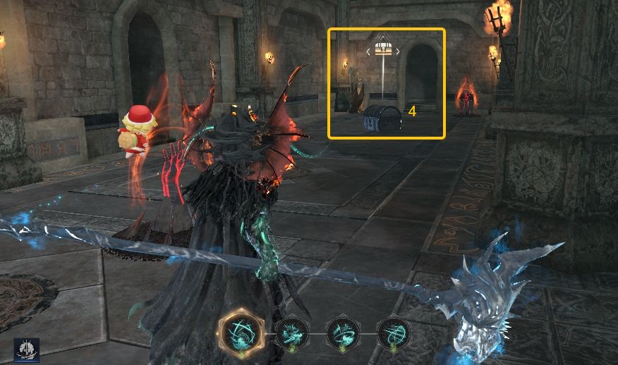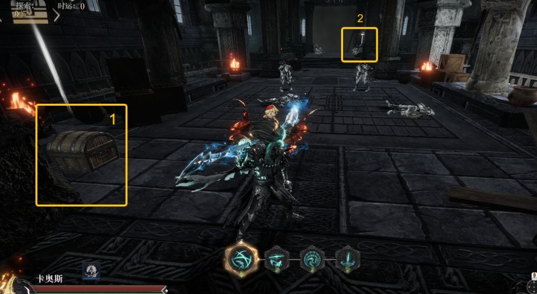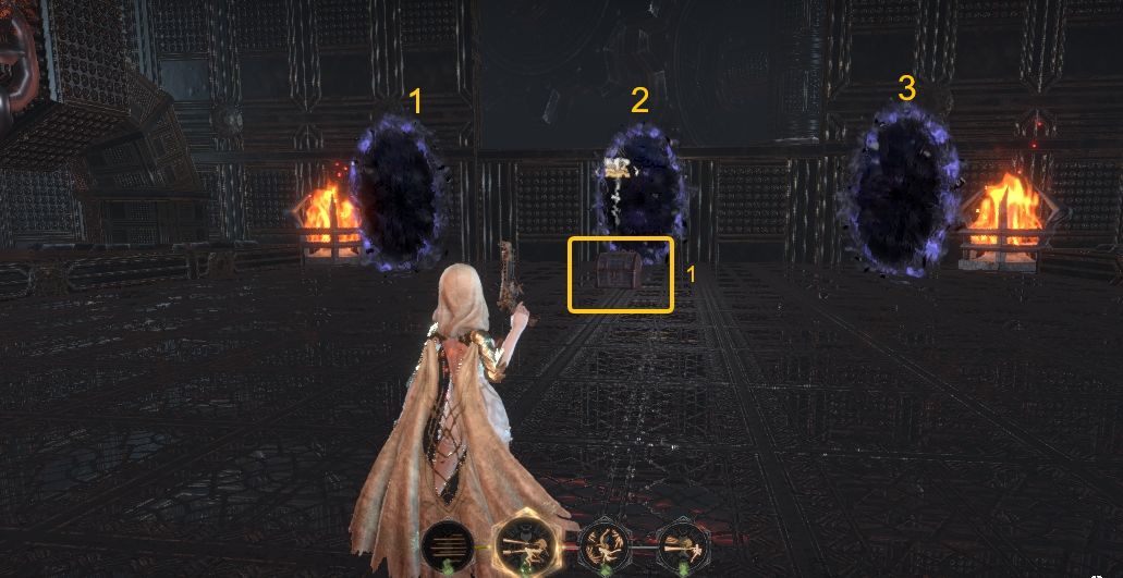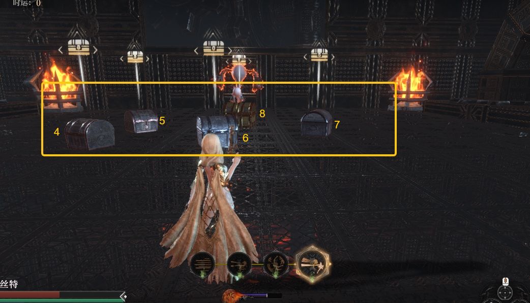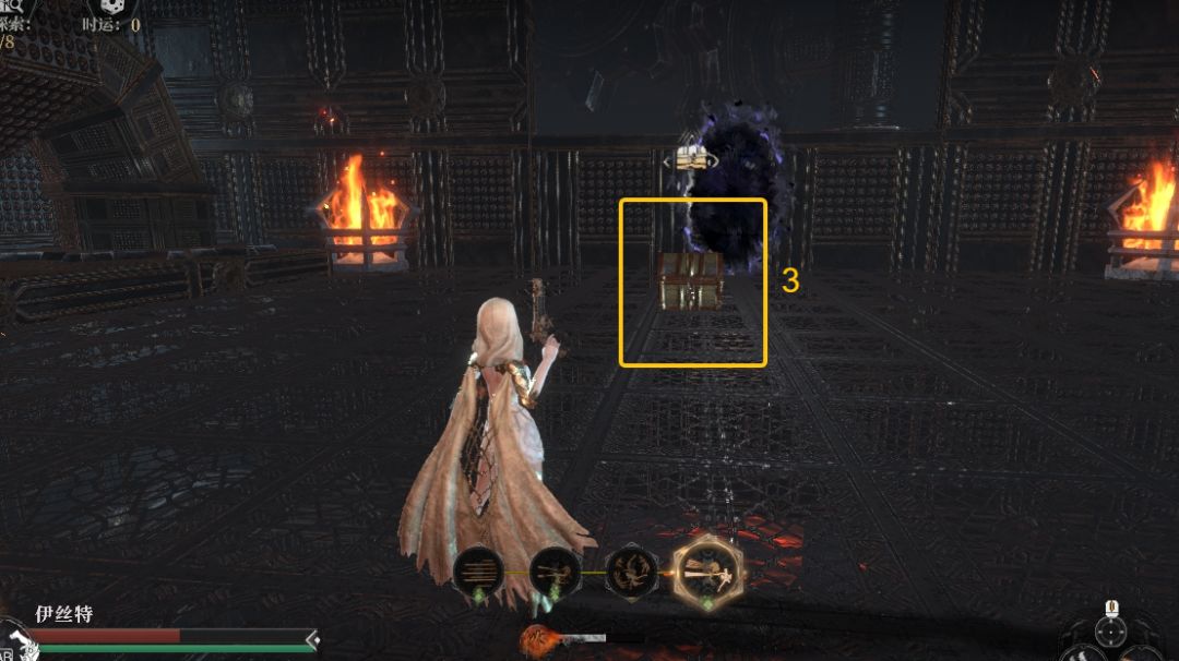 进入后有一个宝箱,将3个火盆点亮刷新出第3个宝箱,之后穿过门回到出生点。
