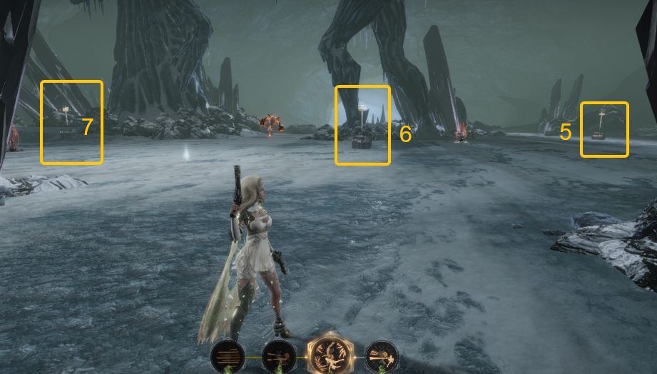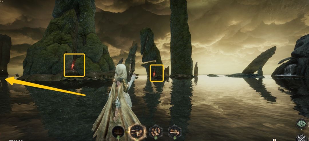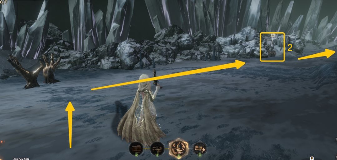 这张地图一共有4个宝箱,这个地图比较空旷,找不到方向的小伙伴可以先看一下这个方位图,难点在于第4个宝箱会在击败左边的石柱后面的怪物后出现。