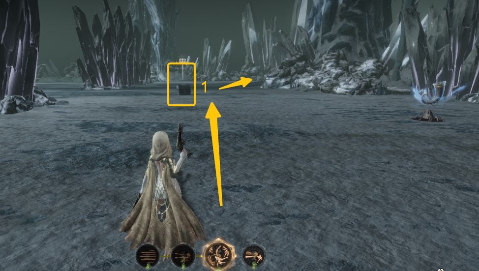 这张地图一共有7个宝箱,这个地图比较空旷而且有解密点,找不到方向的小伙伴可以参考一下这个平面图。在入口处先激活这个发光柱子后继续往前走。