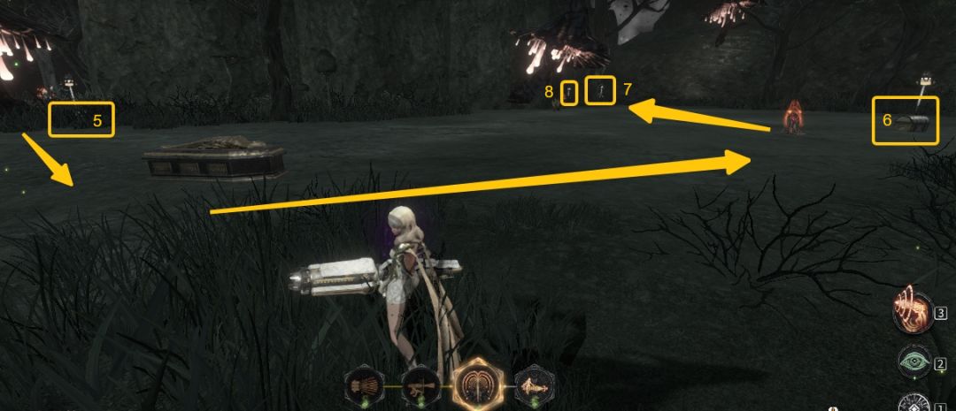 这张地图一共有8个宝箱,,进入关卡后,初始点左边有第1个宝箱,然后在前面的怪物处右转,可以看到第2个宝箱。