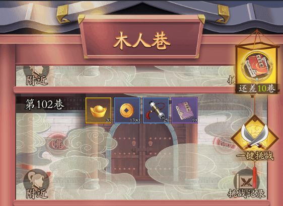 1、进入木人巷/内息巷/噩梦木人巷,可在【可领取奖励】下方找到【一键挑战】按钮;