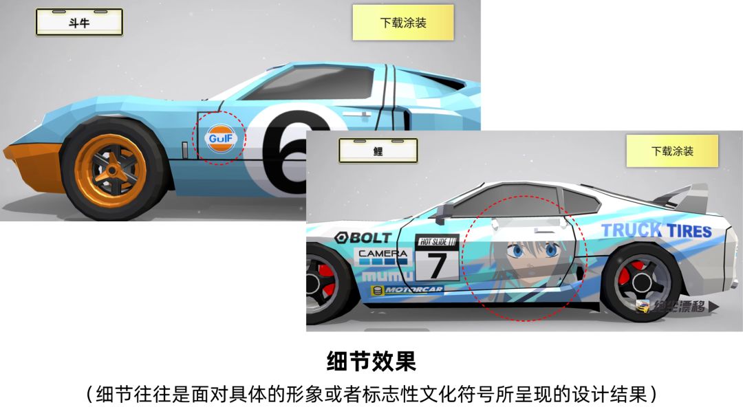 赛车涂装的讲究对与赛事本身的元素进行还原,二次元等动漫卡通形象根据形象本身设计涂装