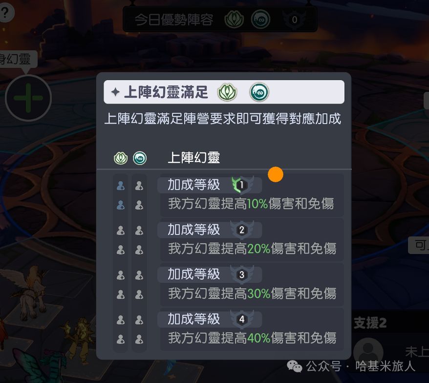 每天的优势阵营不同,每2个对应阵营的角色上场提供10%伤害和减伤(上限40%),以数量较少的阵营为准。