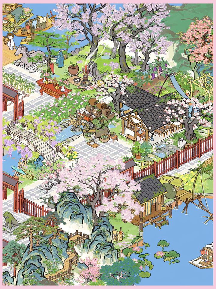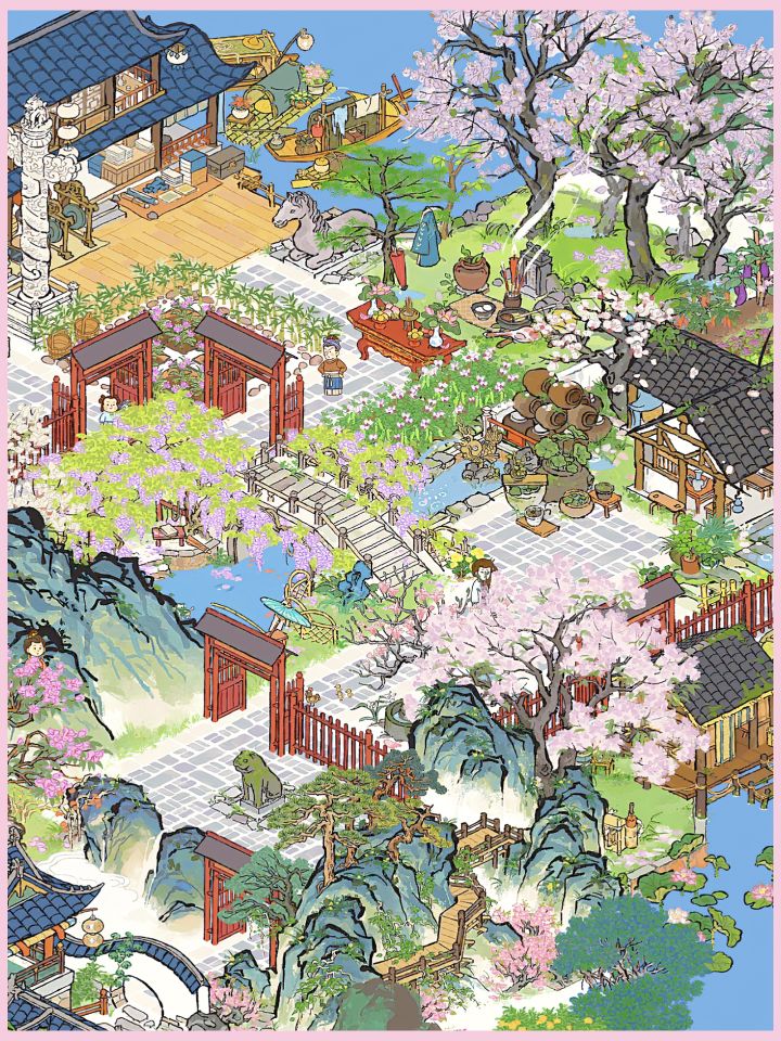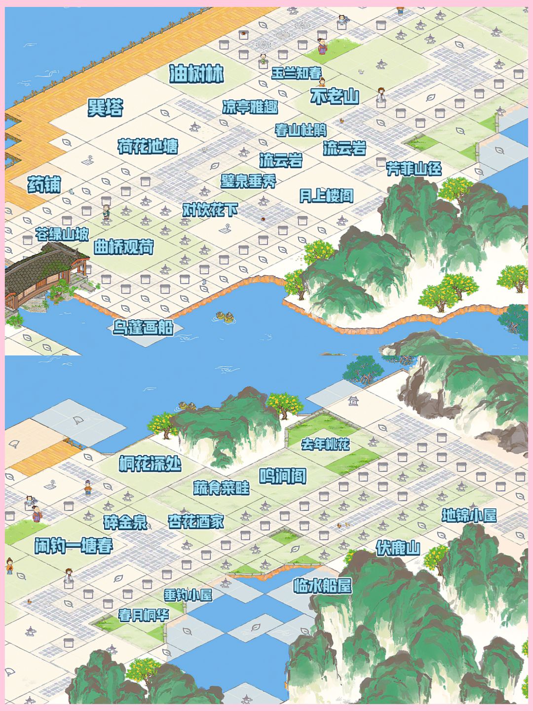 建筑:曲桥观荷、对饮花下、璧泉垂秀、月上楼阁、春山杜鹃、巽塔、油树林、荷花池塘、凉亭雅趣、玉兰知春、流云岩、不老山、芳菲山径、春月桐华、闲钓一塘春、碎金泉、南北行、杏花酒家、桐花深处、鸣涧阁、去年桃花、临水船屋、垂钓小屋