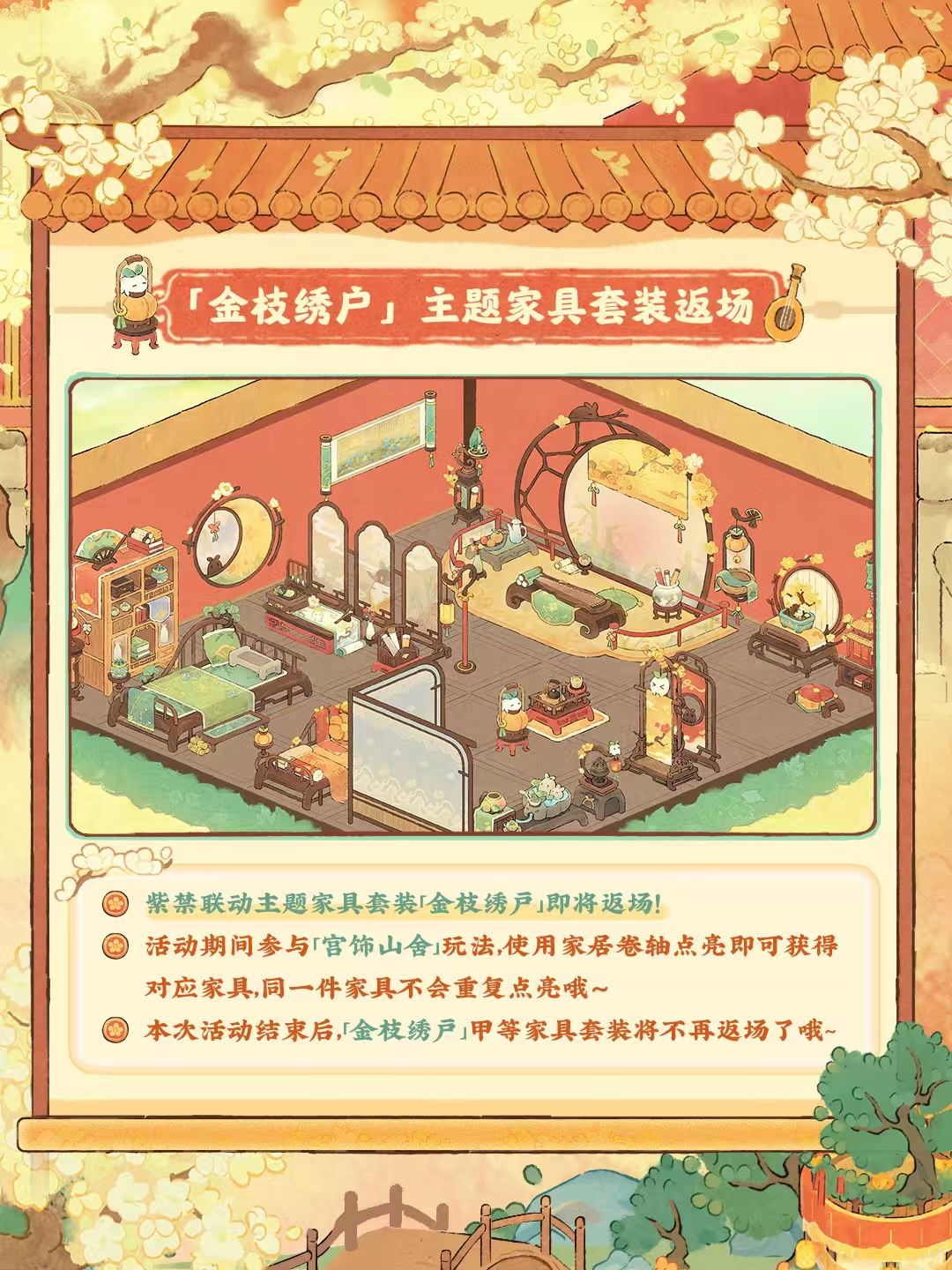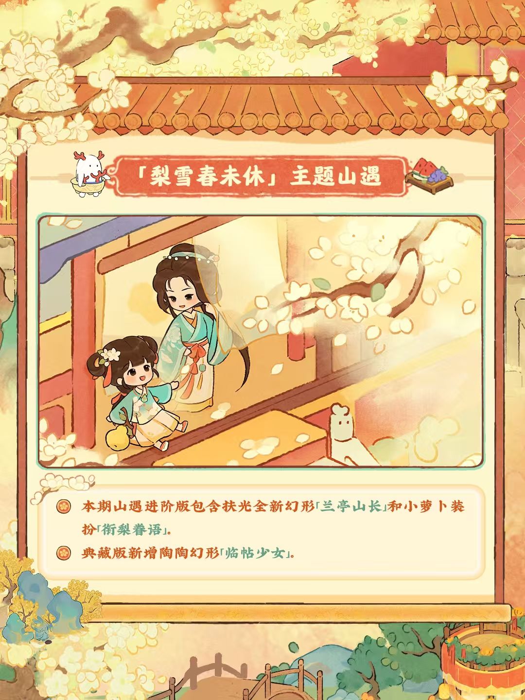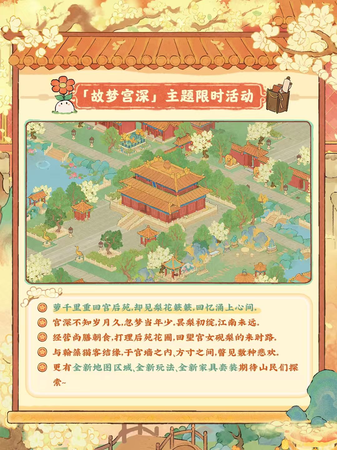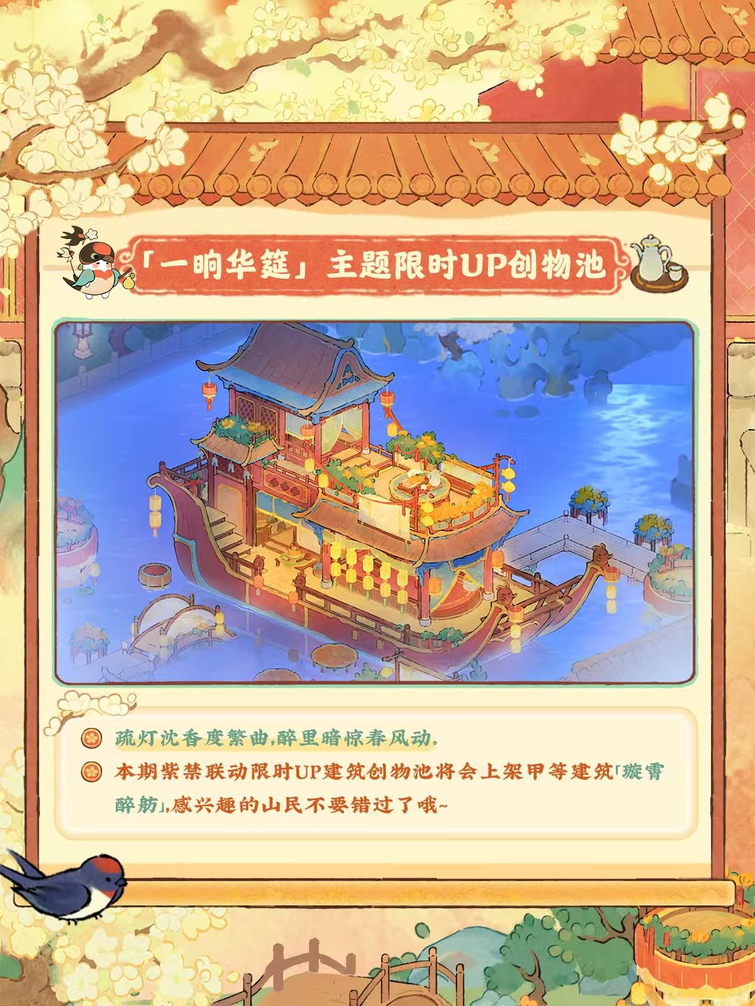 6月19日10点,全新篇章正式启程!活动期间完成任务,可兑换活动限定建筑、头像、背景等奖励哦!同时,紫禁联动限时剧情「梨雨春逝」也将一同开启,山民不要错过萝!