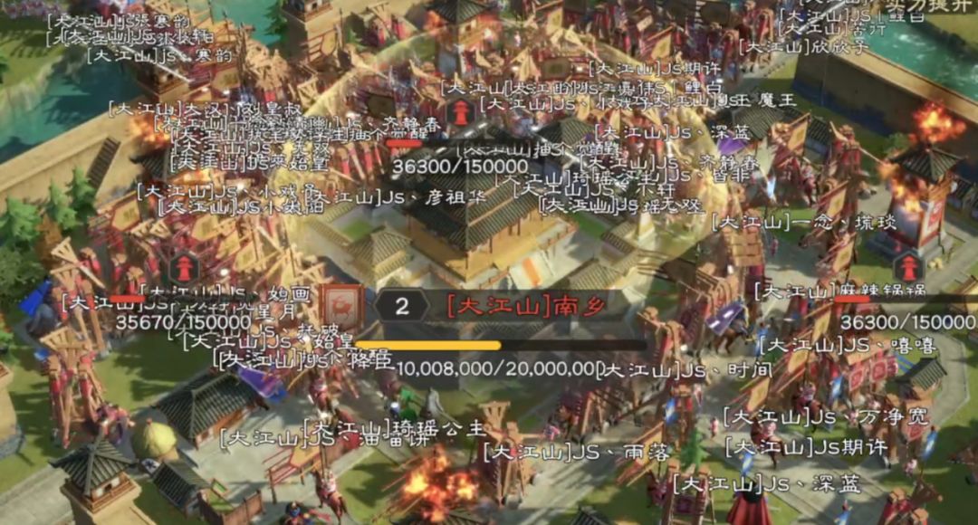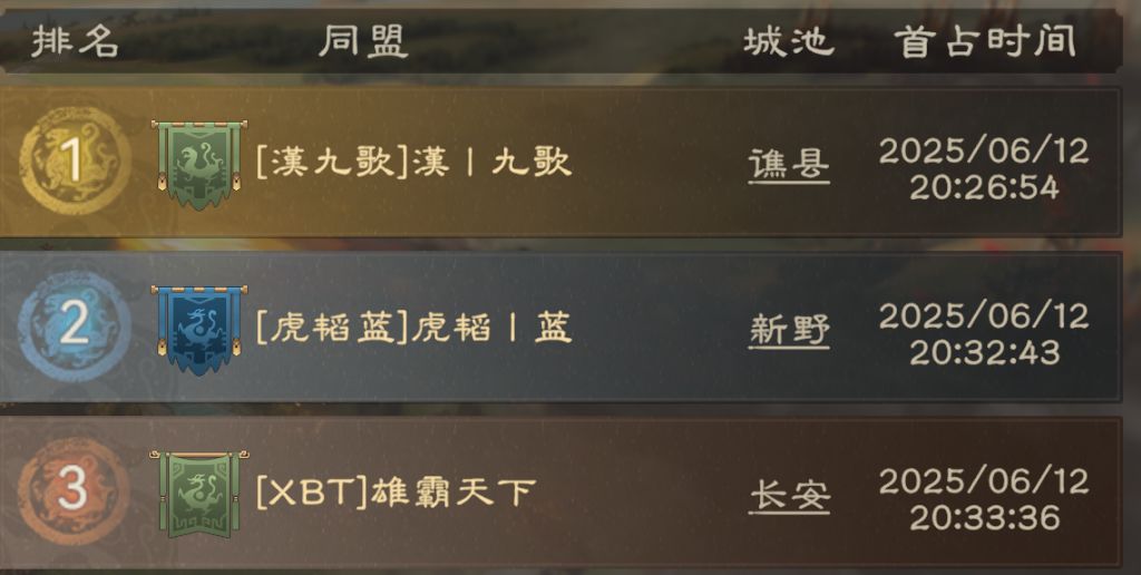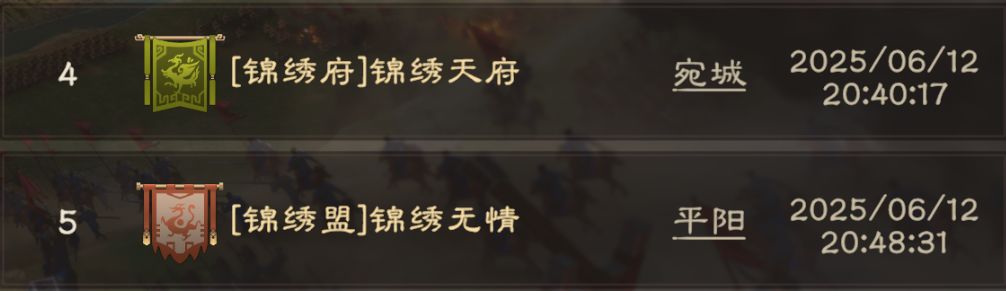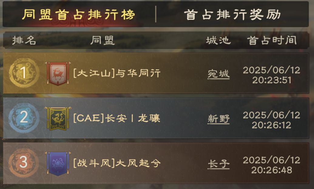 三大同盟攻城进度非常接近,不过最终还是宣战稍早的【大江山】率先于20:23:51夺下宛城;【CAE】在20:26:12攻占新野,也是不错的成绩;【战斗风】在半分钟后也拿下长子,实力可谓都在伯仲之间。