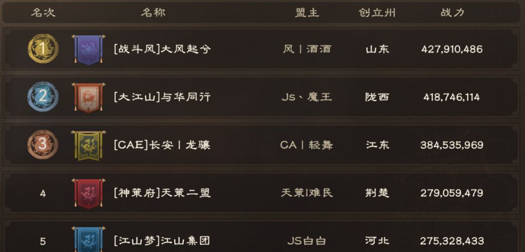 1区同盟战力排行榜如下,【战斗风】和【大江山】突破4亿战力,领跑全区,遭受重创的【天策府】已经掉出前五,资源州格局也在两日间发生巨大改变。