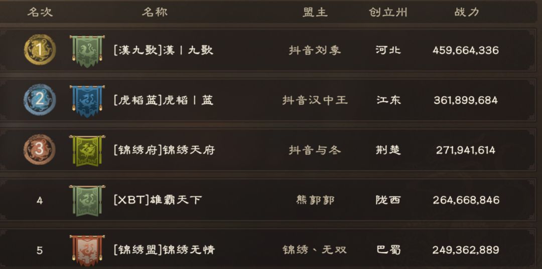 来到2区,【漢九歌】已有霸主之势,战力领先其他同盟1亿之巨。