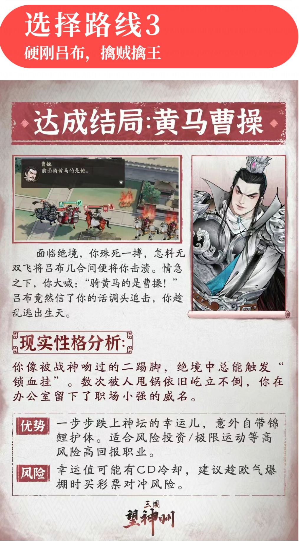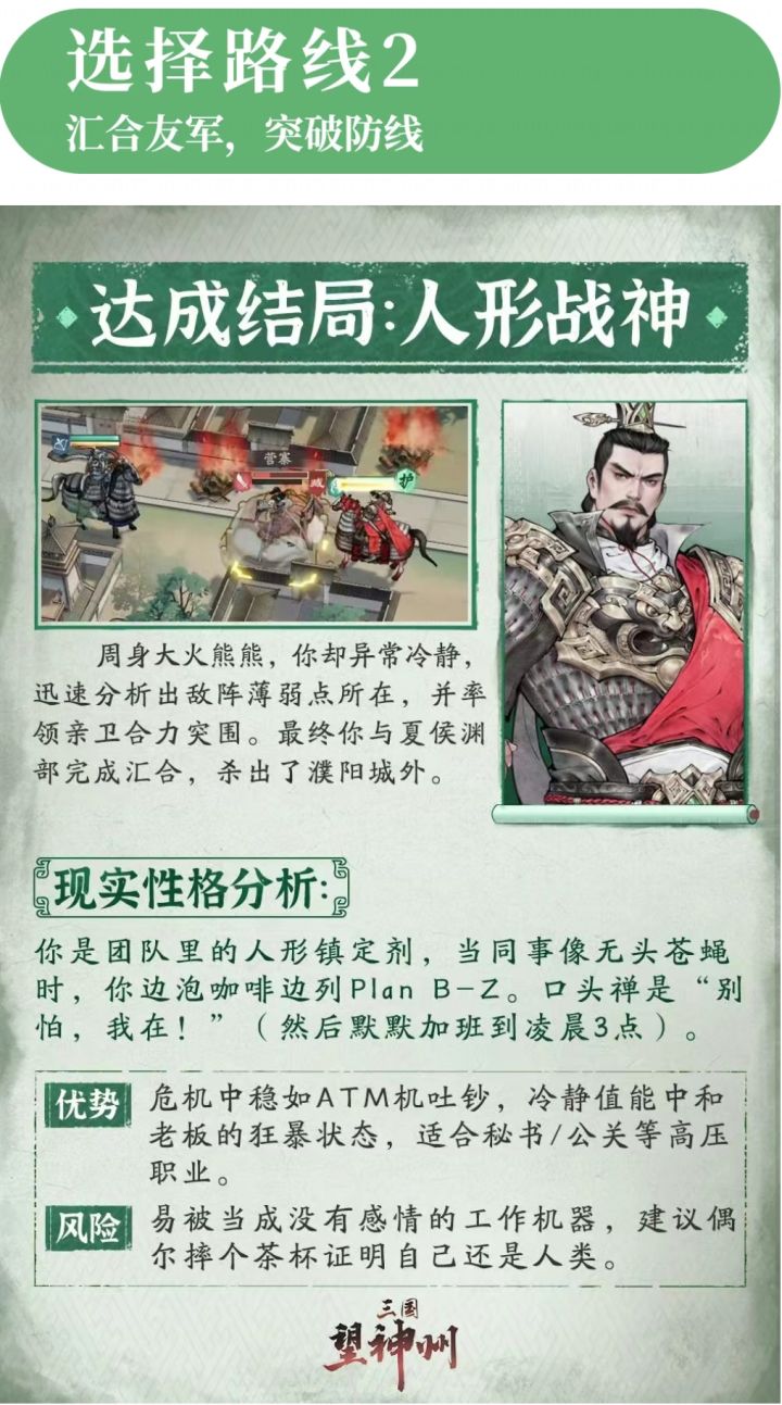 路线3:擒贼先擒王,带队向东北方向突围,**吕布小队,濮阳危机解除。明公可根据自己倾向,滑动图片查看相应结局和自己的职场风格与优势分析。