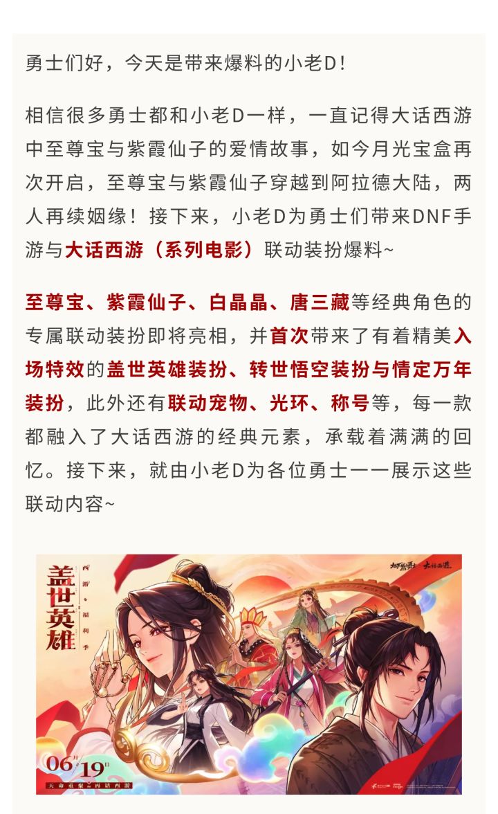 相信很多勇士都和小老D一样,一直记得大话西游中至尊宝与紫霞仙子的爱情故事,如今月光宝盒再次开启,至尊宝与紫霞仙子穿越到阿拉德大陆,两人再续姻缘!接下来,小老D为勇士们带来DNF手游与大话西游(系列电影)联动装扮爆料~