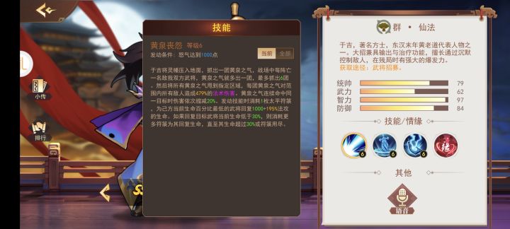 技能一“黄泉丧怨”的特点:很多玩家看到技能一其实就有点打退堂鼓了,相比于其他橙将,于吉的技能一的确很普通,攻不像攻,辅不像辅,奶不像奶。的确,于吉的大招的确太普通。一是抓出黄泉之气对敌方群体目标产生伤害,敌我双方死亡武将越多伤害越大。二是对单体武将进行回复,回复后不低于30%。