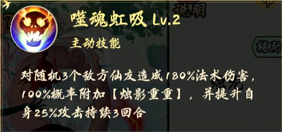 仙友1星激活:对随机3个敌方仙友造成180%法术伤害,100%概率附加【烛影重重】,并提升自身25%攻击,持续3回合