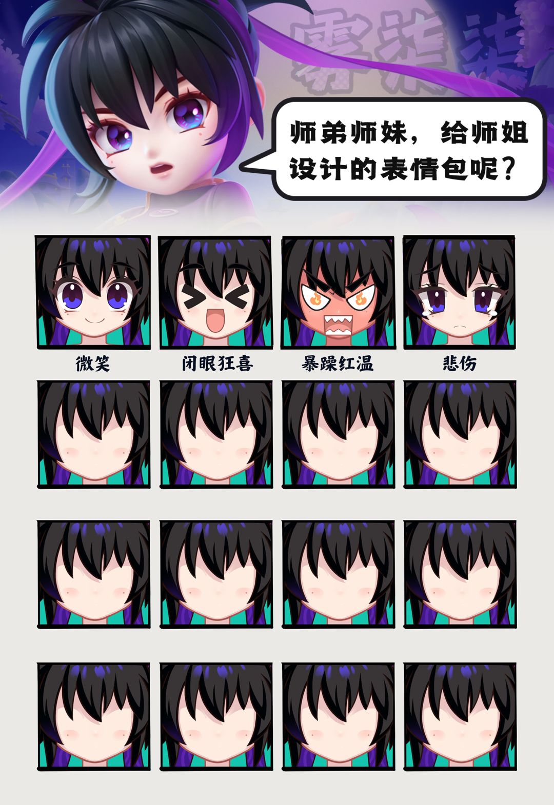 少年们!知道吗?小师姐——雾柒柒 会是在DMM里面,目前表情最丰富、语音最多的角色哦!无论是灵动的眨眼还是俏皮的坏笑,雾柒柒都能完美驾驭!但雾柒柒的百变表情魅力可不止于此哦~现在诚邀少年们为雾柒柒设计更多有趣的表情,让她的情绪库更加丰富!你的创意,或许能成为游戏里的下一款经典表情噢