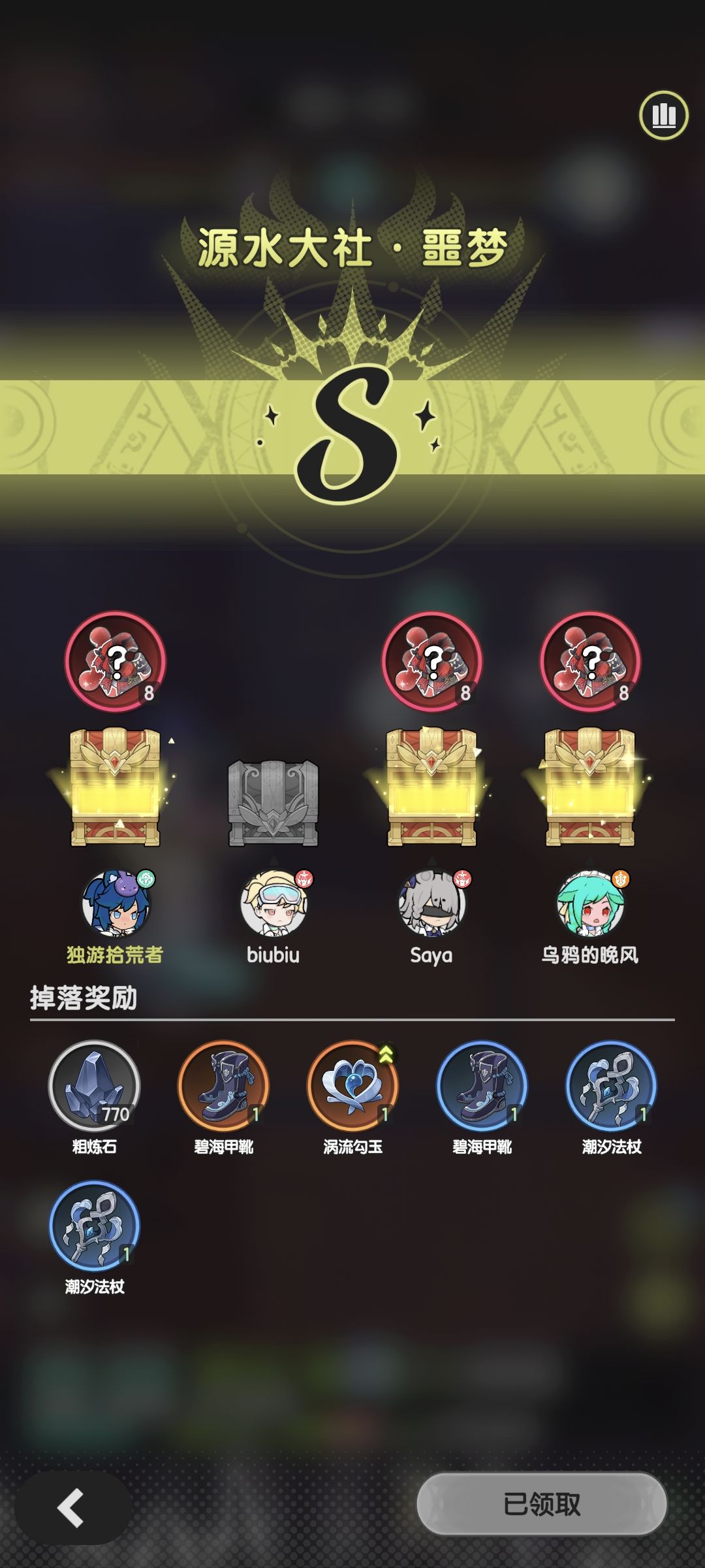 普通源水大社已经打了12次了(全是碎片我也是服了),加上剧情送的6片碎片,总共102片,刚好合成一个金武。正好碎片还差5片,所以就花了钻石直接把暗夜抽出来了。大家不要学我把钻石花光哈,如果战力凹不到145w就等明天再打副本就行。