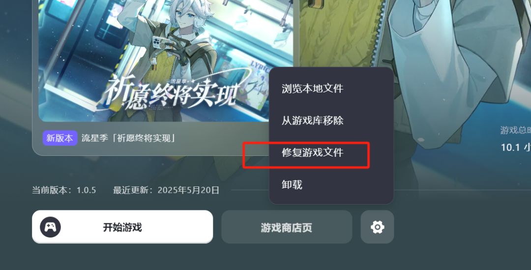 2. 关闭电脑防护软件后打开 TapTap PC 启动器。点击启动器界面上的 “设置” (是一个齿轮图标)。在设置菜单中找到并点击 “修复游戏文件” 选项。等待修复过程完成。修复完成后,尝试启动游戏。