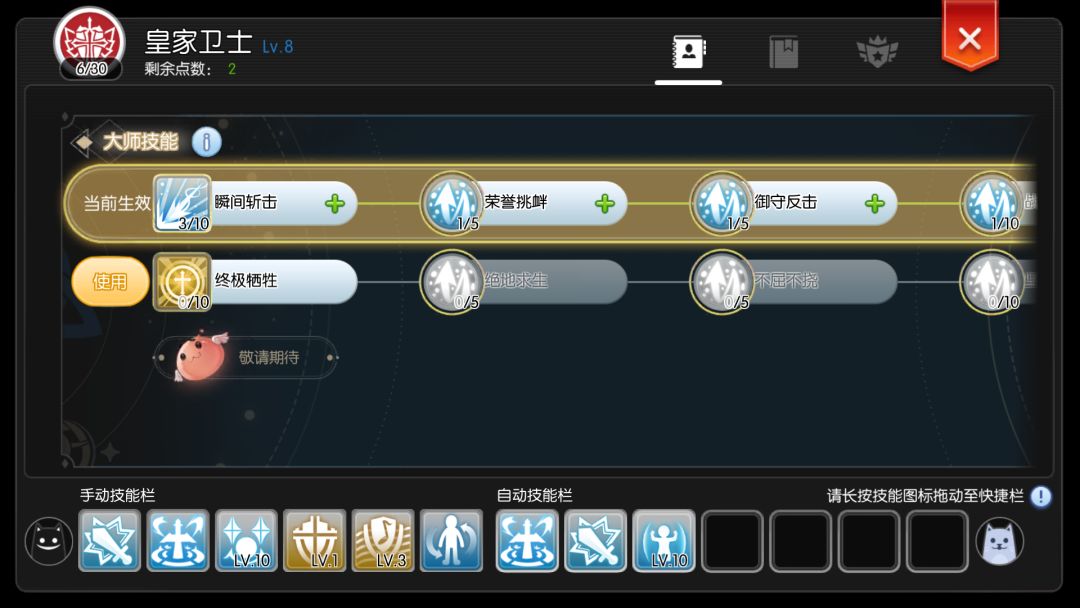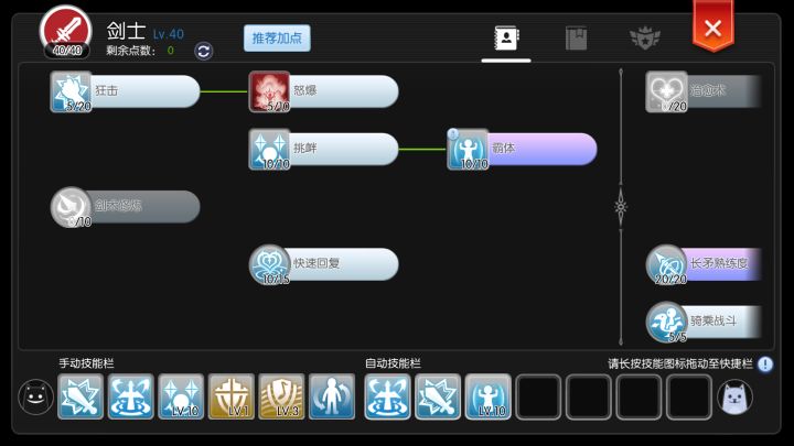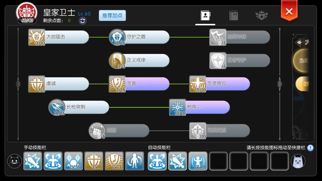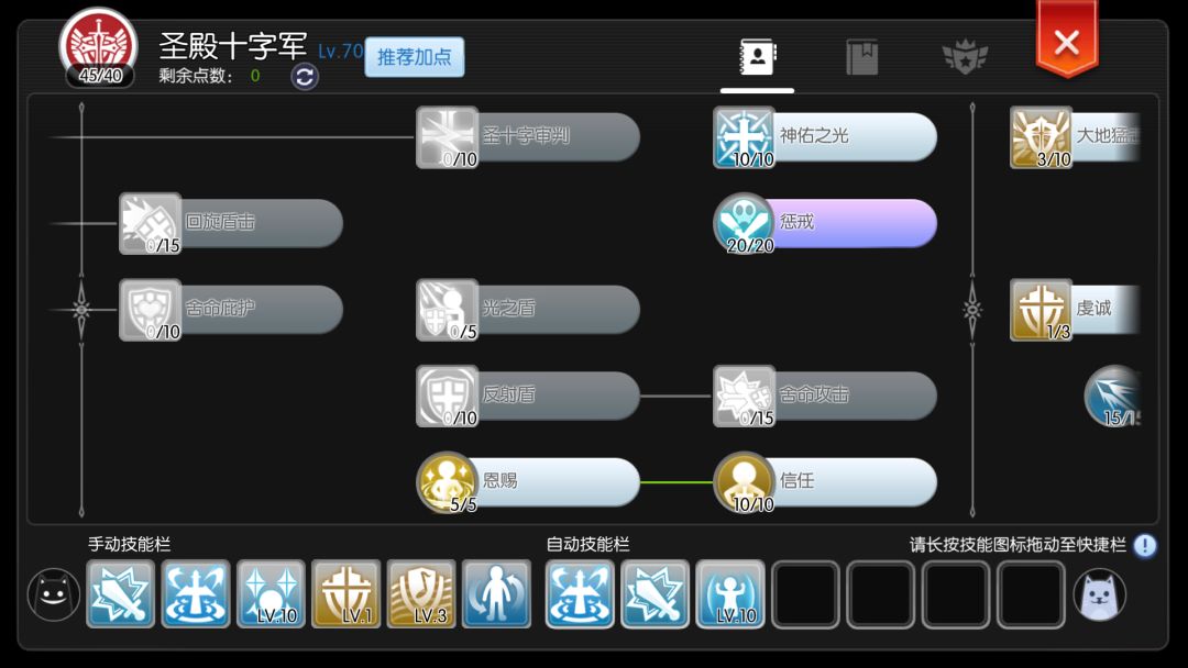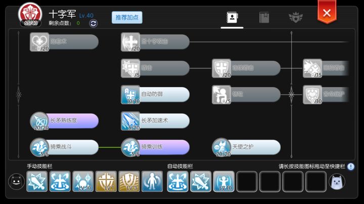 自动防御10,长矛熟练20,长矛加速20,骑乘战斗5,骑乘训练5,天使之护10