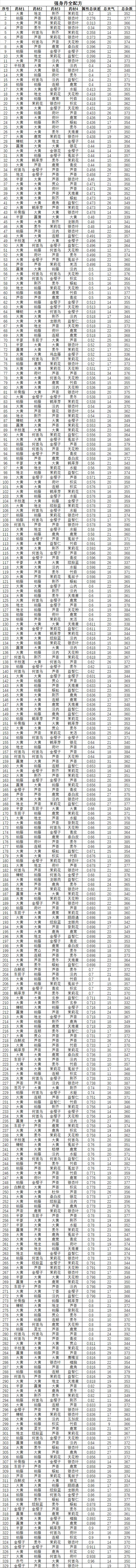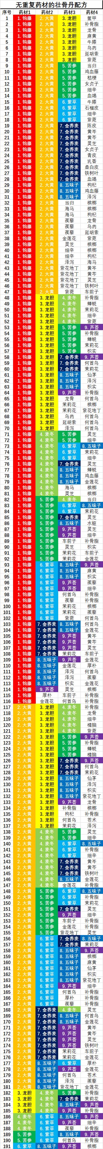 本人前后花了大量时间,整理了所有药材的资料,并通过自编代码,找出了所有符合条件的配方。每种都有丹药都有300多种配方,其中使用四种不同药材的配方也有100多种。从中最终筛选出几个适合搭配、能炼出更多丹药的配方。例如,开慧丹可以有三种使用药材完全不同的配方。
