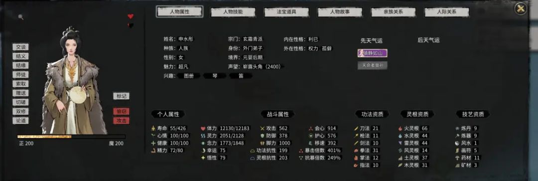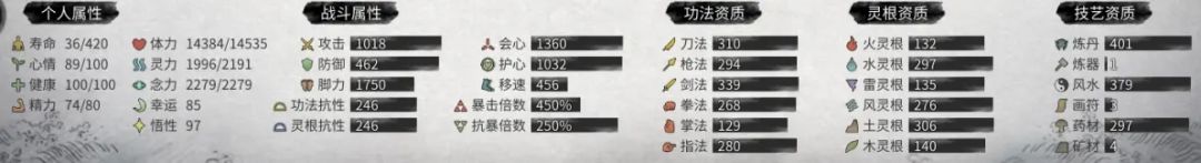 2、战斗属性攻击,防御,脚力,物免,魔免,会心,护心,移速,会心倍率,护心倍率。3、功法资质刀法,枪法,剑法,拳法,掌法,指法。4、灵根资质火灵根,水灵根,雷灵根,风灵根,土灵根,木灵根。5、技艺资质炼丹,炼器,风水,画符。6、内在性格无私 ,正直, 仁善, 中庸, 狂邪 ,利己, 邪恶。7、外在性格天伦 ,义气, 护短 ,孤僻, 爱家, 名声, 权利, 睚眦, 任我, 情种, 传承, 忠贞。8、交互行为对话,结义,结缘,师徒,索取,赠送,切磋,偷窃,攻击,双修,交易,学艺,请求,复仇。