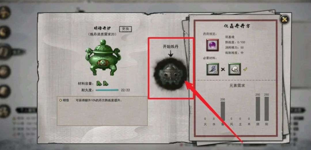 而不同的丹炉,可以加入的药材种类是有限的,例如最低级的丹炉只能加入三味药材,那我们就要找3种药材,加起来的数值能达到筑基丹的要求。而炼丹时,有个小游戏,决定了我们可以将药材的多少元素打入丹炉,最后决定能炼出与否,以及品阶。
