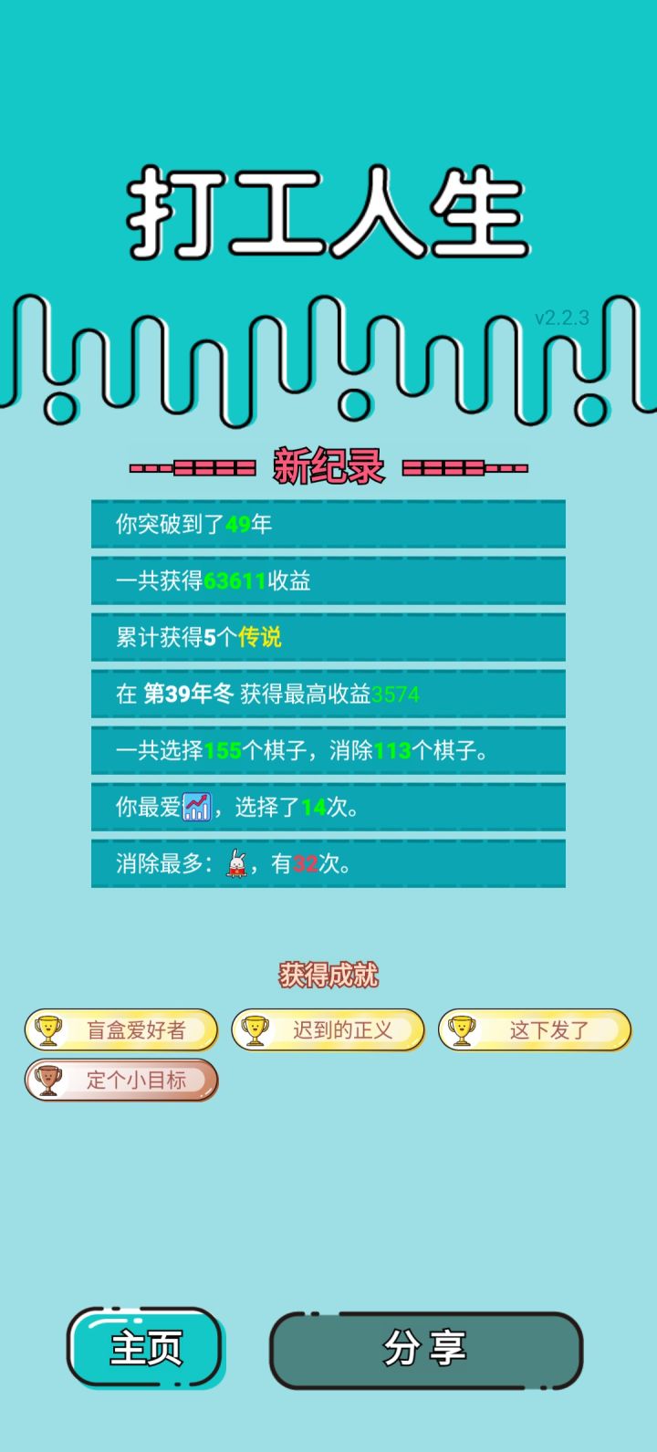 我打工坚持了49年。共获得63611收益。累计获得5个传说棋子。共选择155个棋子,消除113个棋子。获得了4个成就!