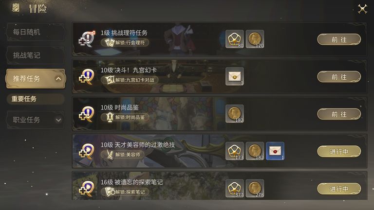 支线任务方面也与端游保持一致,分为带蓝色加号的重要任务以及黄色的普通任务。水晶世界将当前等级能够接取的重要任务都统合进了推荐任务界面里,并且在重要任务名称下方会显示完成该任务解锁的功能,点击任务右边的前往即可直接追踪该任务。