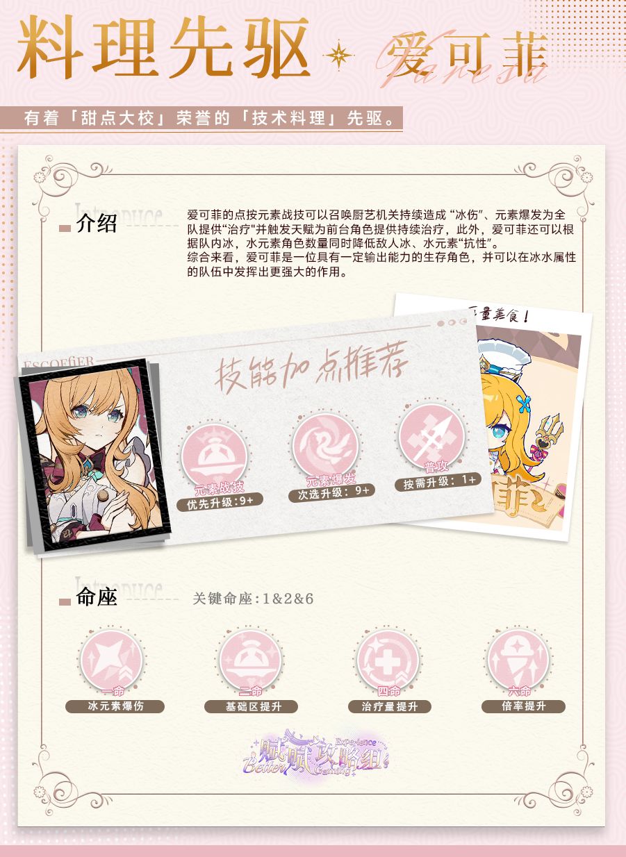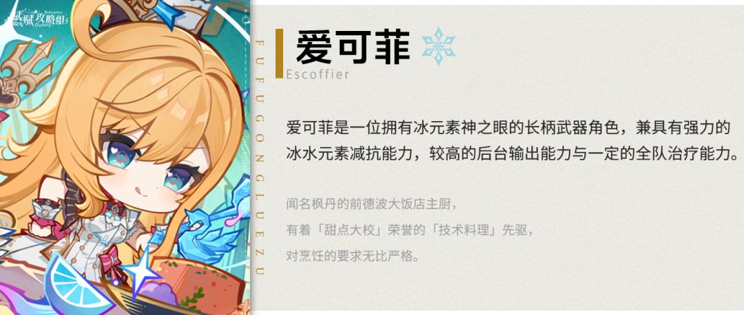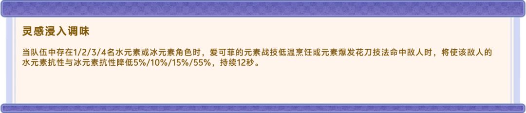 此天赋是对爱可菲拐力的补足,可以通过队伍内冰水元素角色数量的限制使敌方目标的抗性降低,从而使队伍的总伤害获得提升,使爱可菲在冰水队中获得一定的额外收益。