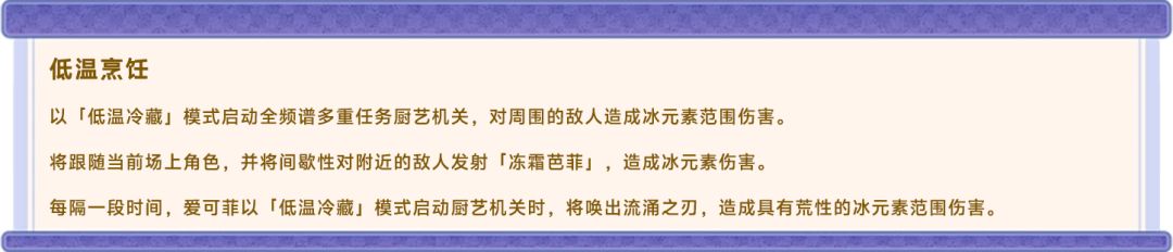 爱可菲点按元素战技将以【低温冷藏】模式启动全频谱多重任务厨艺机关,对周围的敌人造成冰元素范围伤害。并使厨艺机关跟随当前场上角色,间歇性对附近的敌人发射「冻霜芭菲」,造成冰元素伤害。