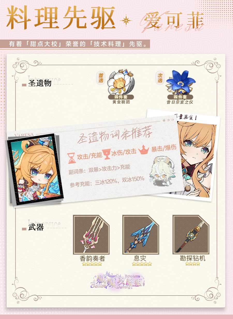 解析:通过暴击触发产球效果,优化全队循环,小幅提升爱可菲的辅助能力。